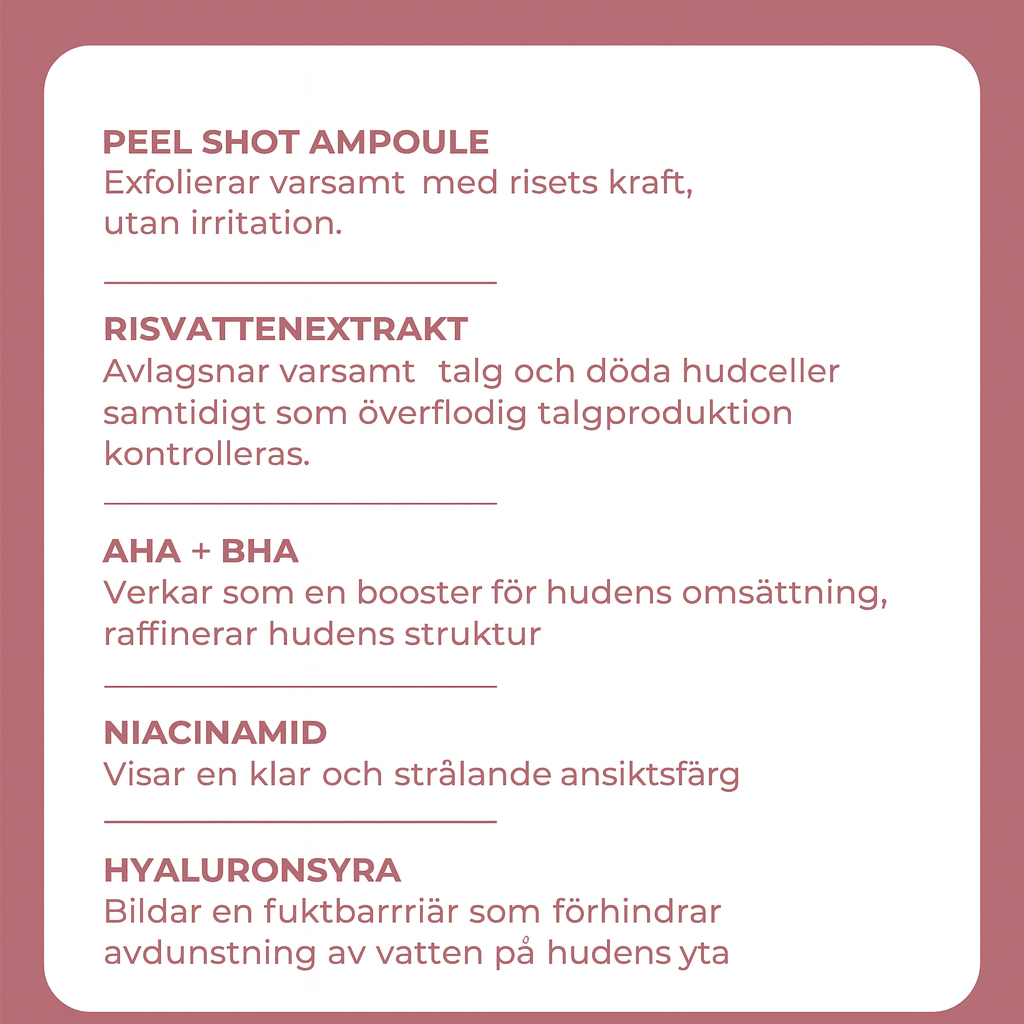 QuintaBeautys Peel Shot Glow Rice Ampoule Duo har skapats för kvinnor som du – kvinnor som vill kĂ€nna sig stolta över sin hud. Oavsett om du har problem med pormaskar, förstorade porer eller en grov hudstruktur som gör att du undviker nĂ€rbilder eller stark belysning, hjĂ€lper denna formula dig att ta tillbaka din kraft.